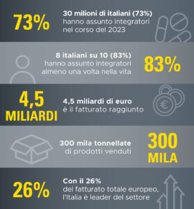 Il ruolo di crescente centralità dei nutraceutici per contribuire al mantenimento del benessere emerge da alcuni dati rilevati nell’anno 2023, riportati qui di seguito, presentati all’assemblea annuale di Integratori & Salute tenuta a Roma il 3 ottobre del 2024. 2